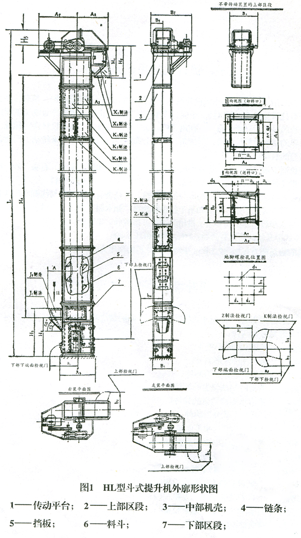 我廠生產的HL型環鏈離心斗式提升機,由運動部分(料斗與牽引鏈條)、帶有傳動鏈輪的上部區段,帶有拉緊鏈輪的下部區段、中間機殼驅動裝置及逆止制動裝置等組成(見圖1)。